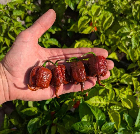 Növénye 130 cm magas, kordonos termesztést igényel. Terméseráncos, gyűrött, 2-3 cm hosszú, csokoládé színű.
